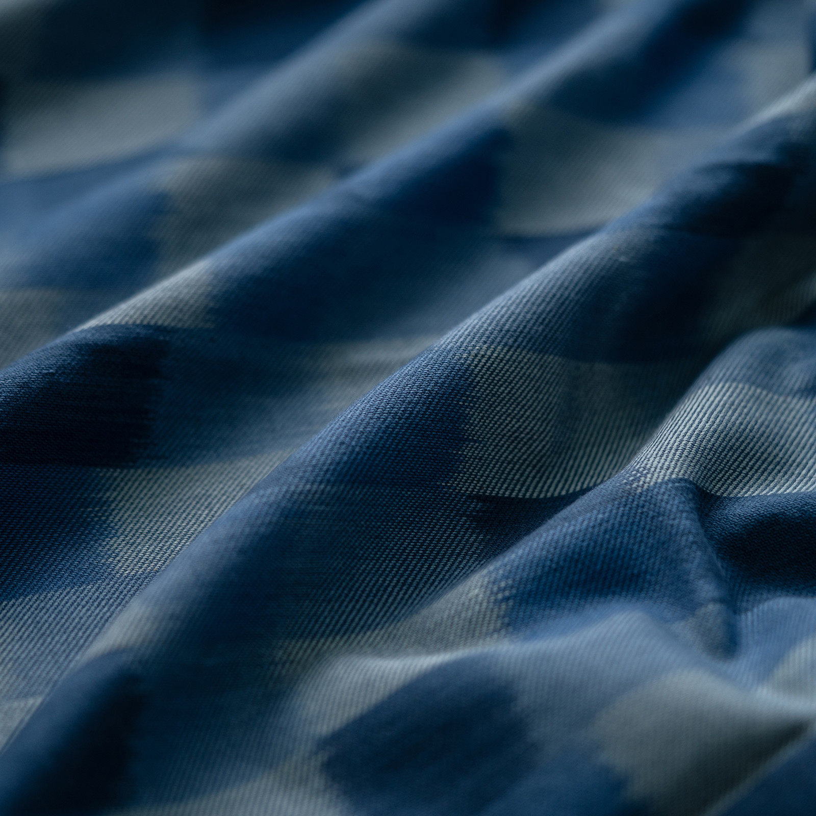 A handcrafted Ikat fabric created by master weavers in Myanmar. This unique design uses heritage skills passed down through generations of Ikat artisas in Inle Lake, Shan State. The process requires hand tying and dying each individual coloured section of yarn, before hand weaving the dyed yarn into a fabric.