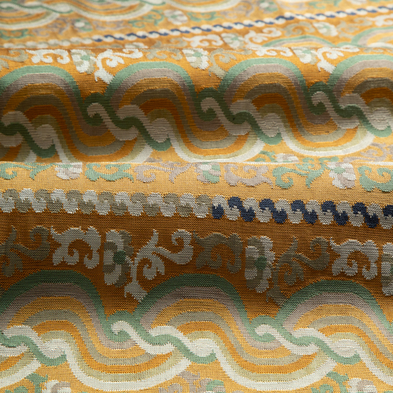 A handcrafted 100% silk fabric, created by master weavers in Myanmar. This design honours heritage motifs from the Burmese Acheik textile tradition, with pattern motifs dating back a thousand years. The fabric is meticulously woven on a village frame loom in Sagaing State. The weaving process uses 100 shuttles in an incredibly skillful process, with few artisans left able to create such intricate work. Turquoise Mountain is working to preserve and protect this artisan weaving skill, and celebrate the beautiful Acheik visual heritage.