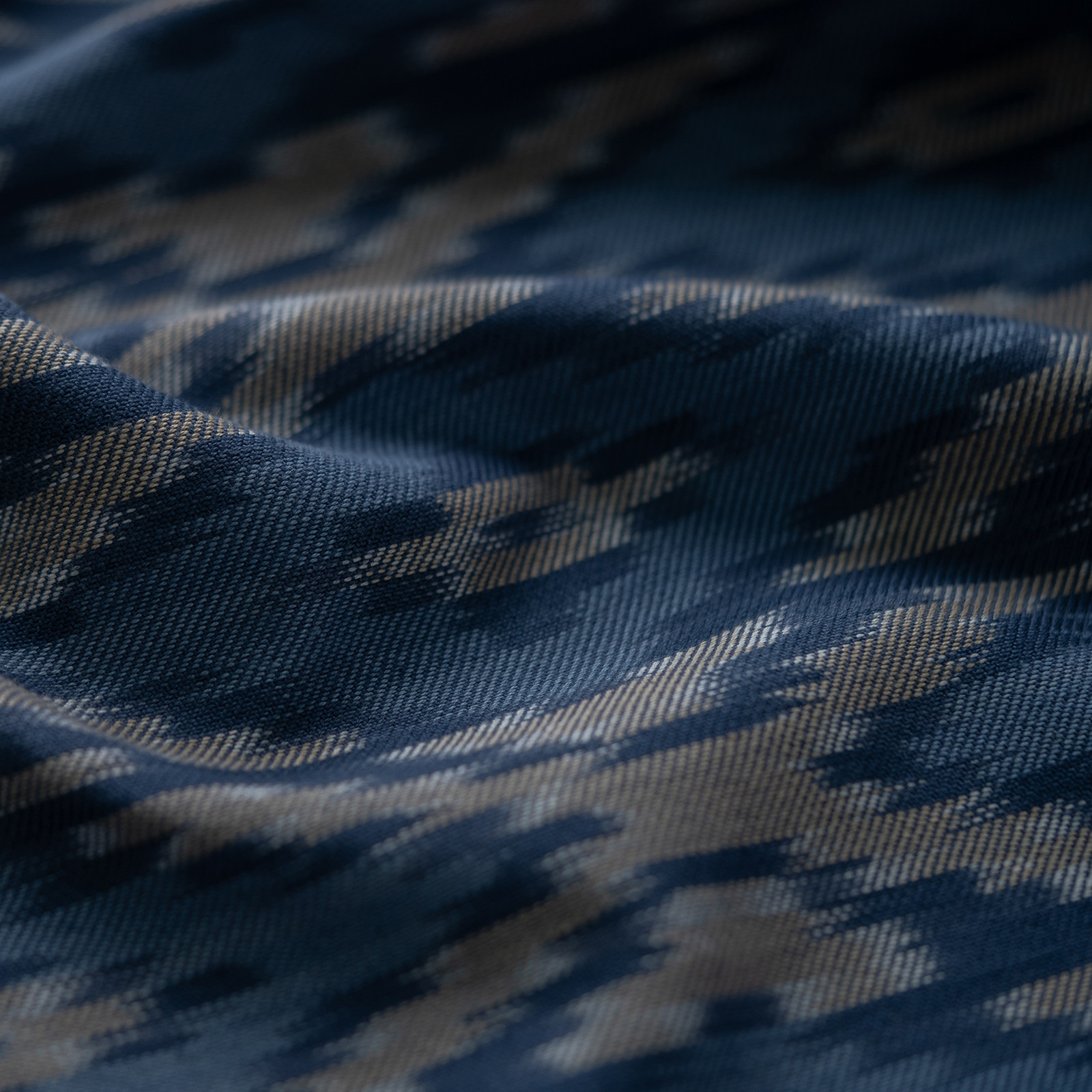 A handcrafted Ikat fabric created by master weavers in Myanmar. This unique design uses heritage skills passed down through generations of Ikat artisas in Inle Lake, Shan State. The process requires hand tying and dying each individual coloured section of yarn, before hand weaving the dyed yarn into a fabric.